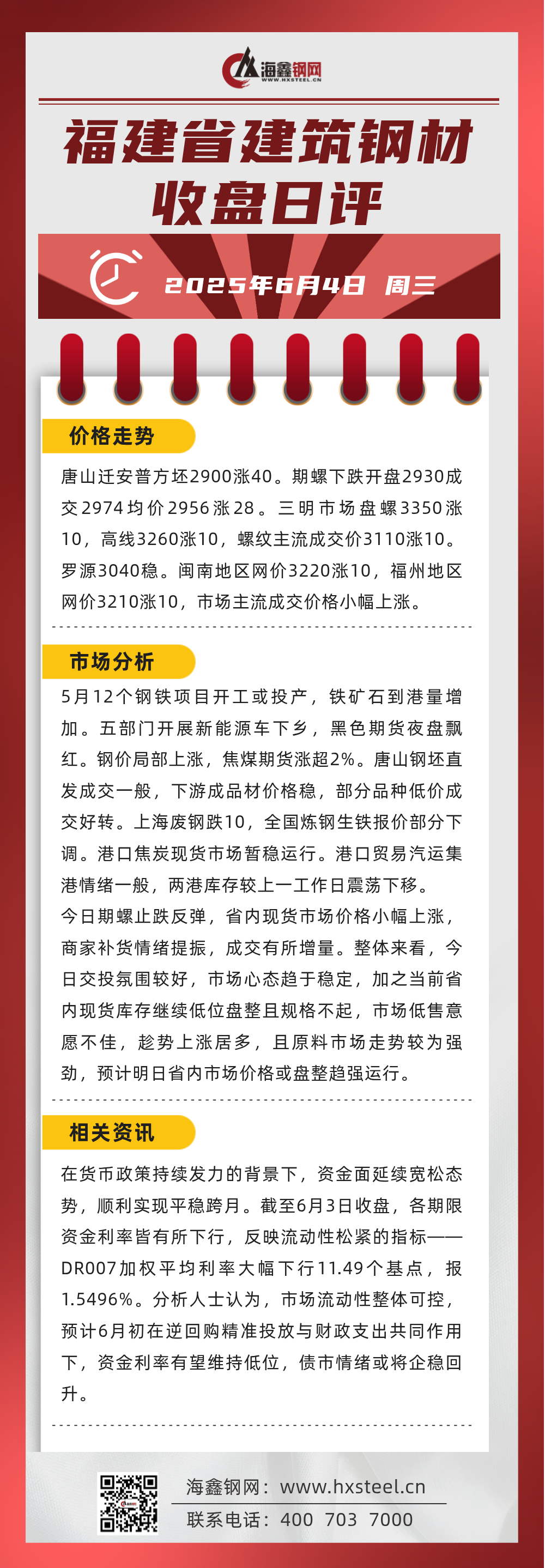 6月4日福建省內建筑鋼材收盤日評
